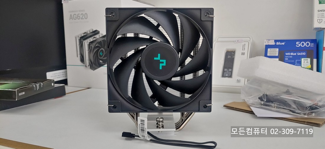 이번 사진에서도 새로 준비된 AG400 Digital 쿨러는 싱글 타워 구조와 대형 팬을 갖추고 있고, 기본 쿨러와 비교하면 방열판 면적 자체가 확연히 다릅니다. 이런 차이는 실제 온도 관리뿐 아니라 소음 측면에서도 이점이 있습니다. 큰 팬은 같은 냉각량을 내면서도 더 낮은 회전수로 동작할 수 있기 때문입니다.