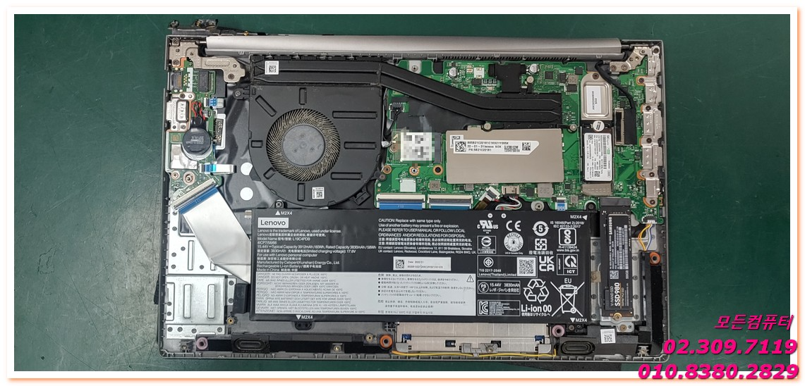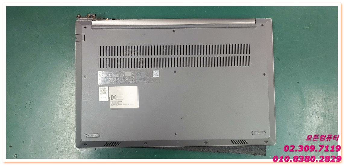 노트북을 사용하다 보면 액정이 열릴 때 한쪽이 뻣뻣하거나, 하단 케이스가 벌어지는 증상을 경험하는 경우가 있습니다. 이번에 입고된 레노버 씽크북 모델 역시 우측 하단 힌지 부위가 파손되면서 케이스가 벌어지고, 내부 부품이 외부로 드러난 상태였습니다.